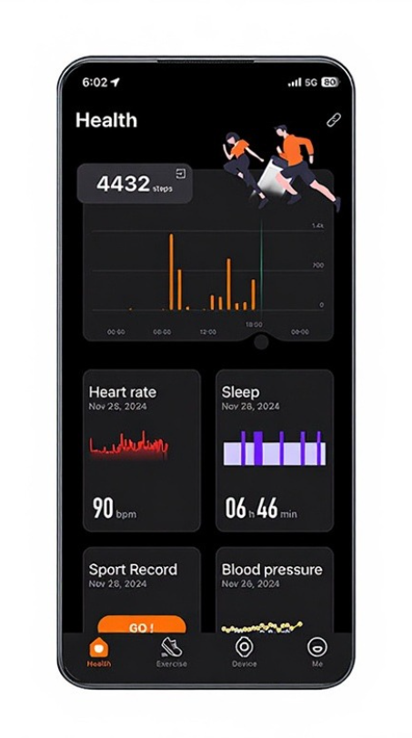Wir glauben an Produkte, die dein Leben einfacher, gesünder und bewusster machen. Darum haben wir diesen Fitness-Tracker ausgewählt – ein schlankes, elegantes Band, das Schlaf, Schritte, sportliche Aktivitäten, Herzfrequenz, Blutdruck, Blutsauerstoff, Stress und HRV misst und dich diskret über Anrufe oder Nachrichten informiert.